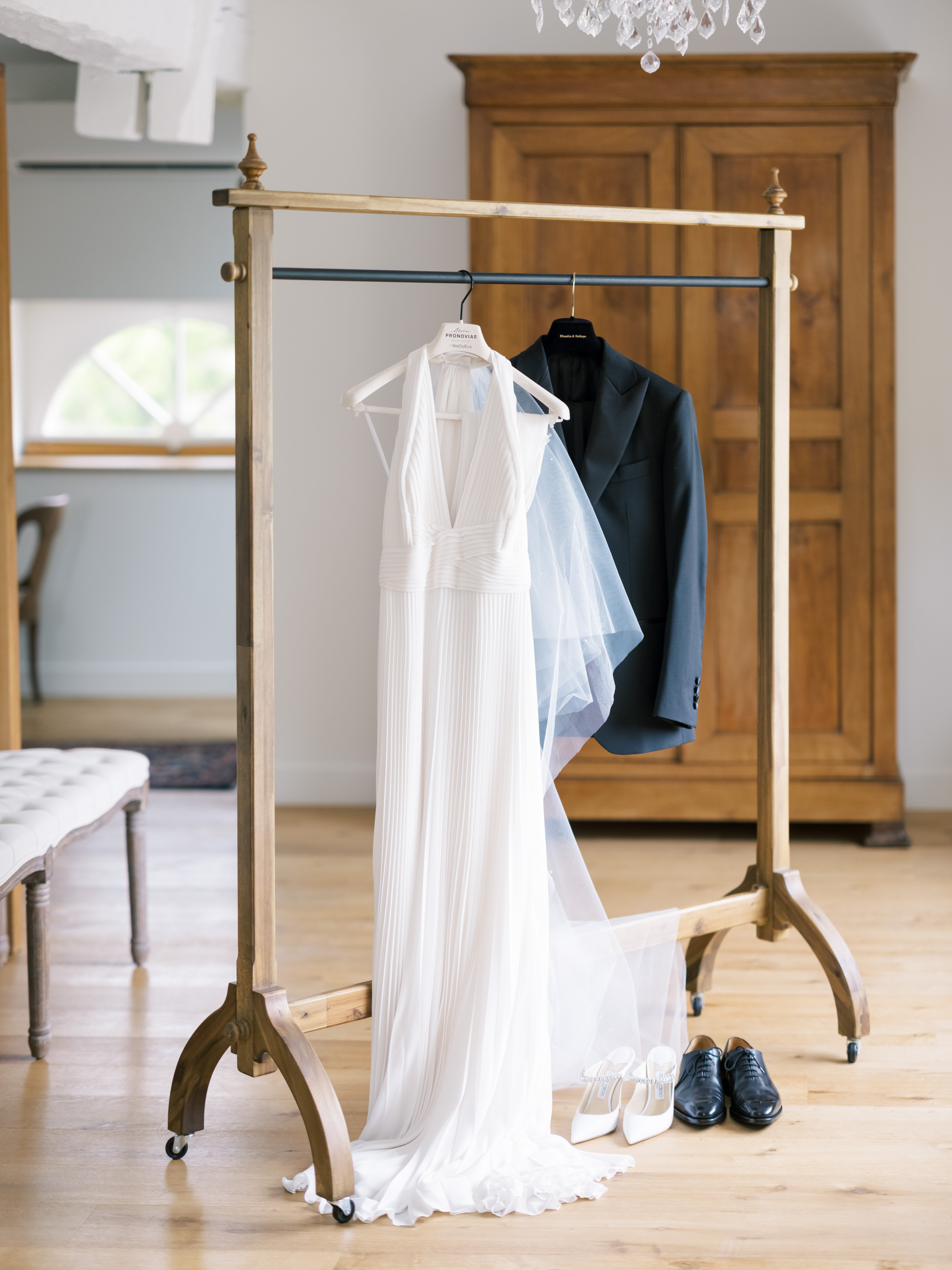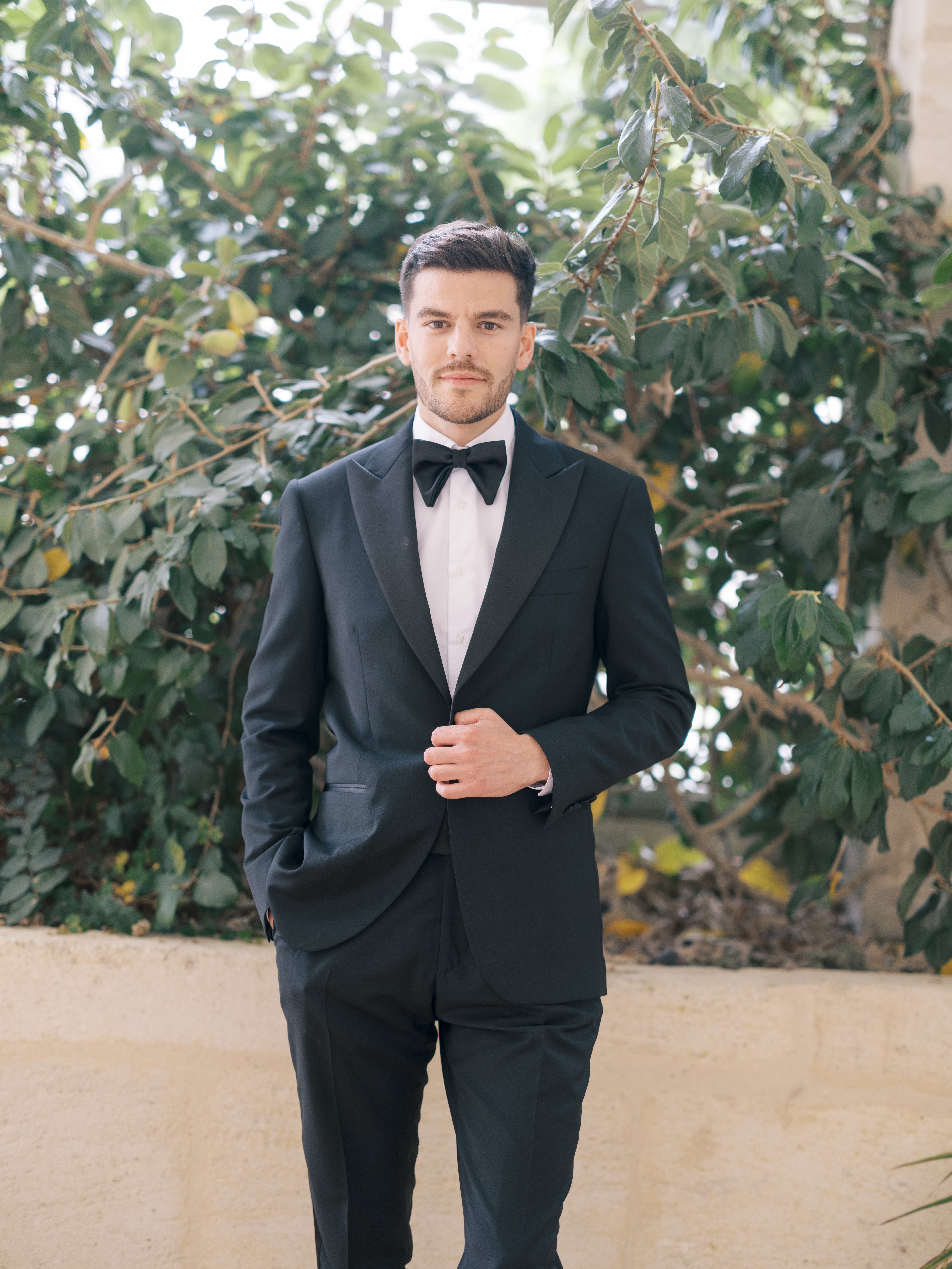 Across the chateau's terraces and grounds, the couple moved through a series of portraits that balanced editorial precision with genuine warmth. The groom's transition from black tuxedo to blue double-breasted Blandin Delloye suit brought a fresh energy to the evening frames. Their exit in a vintage Citroen DS limousine, winding through vineyard roads at dusk, gave the session its most cinematic moment.