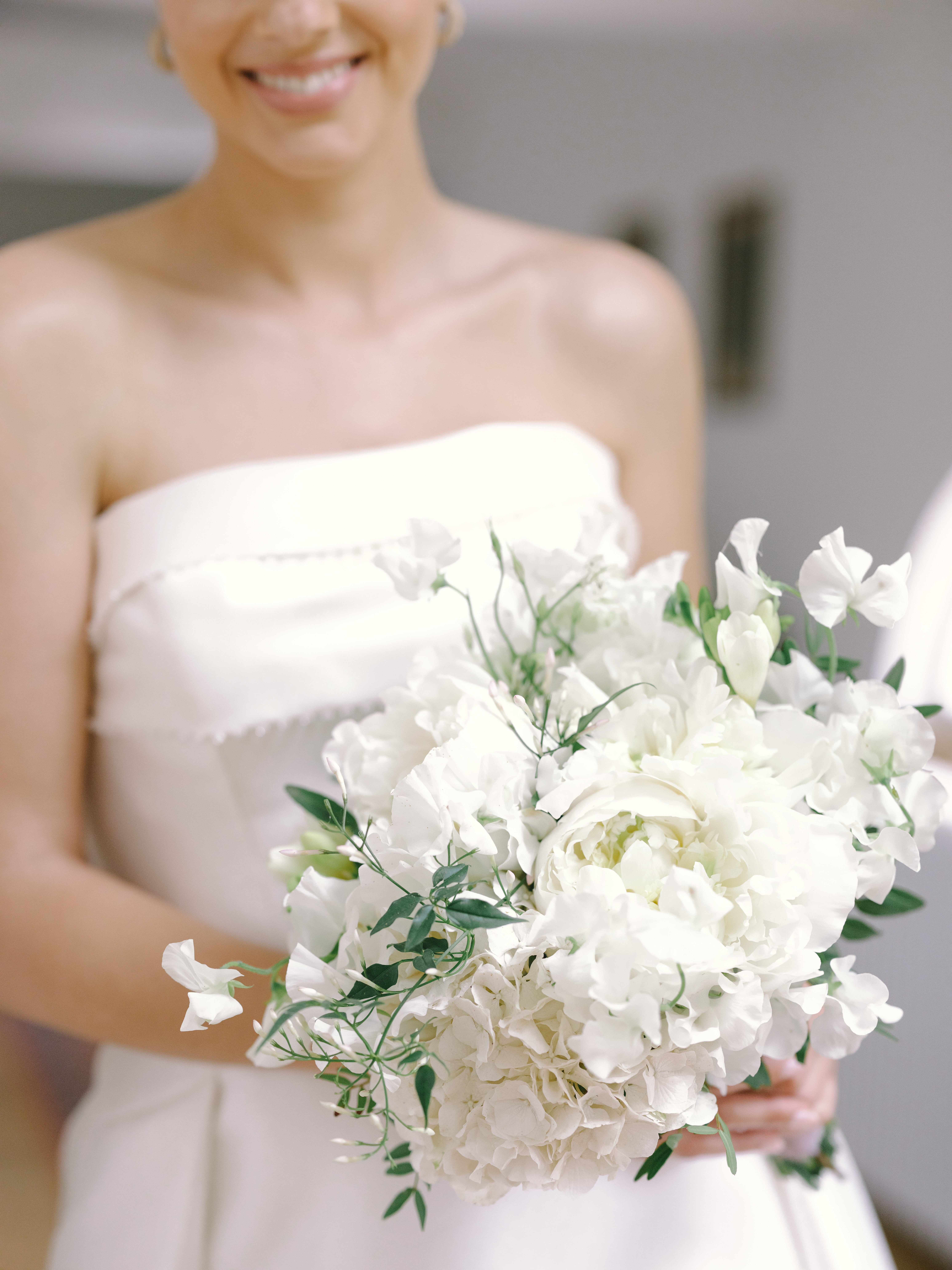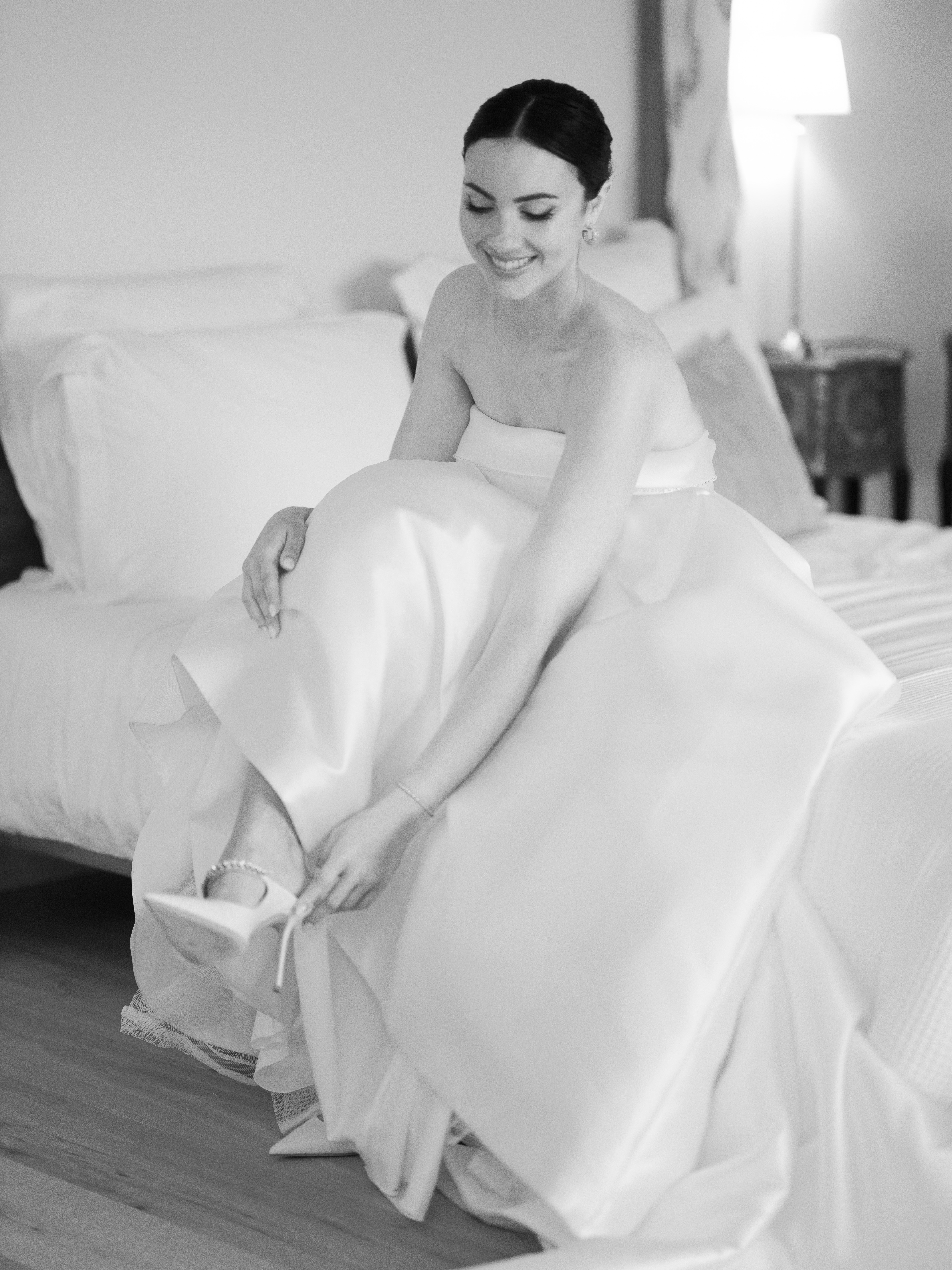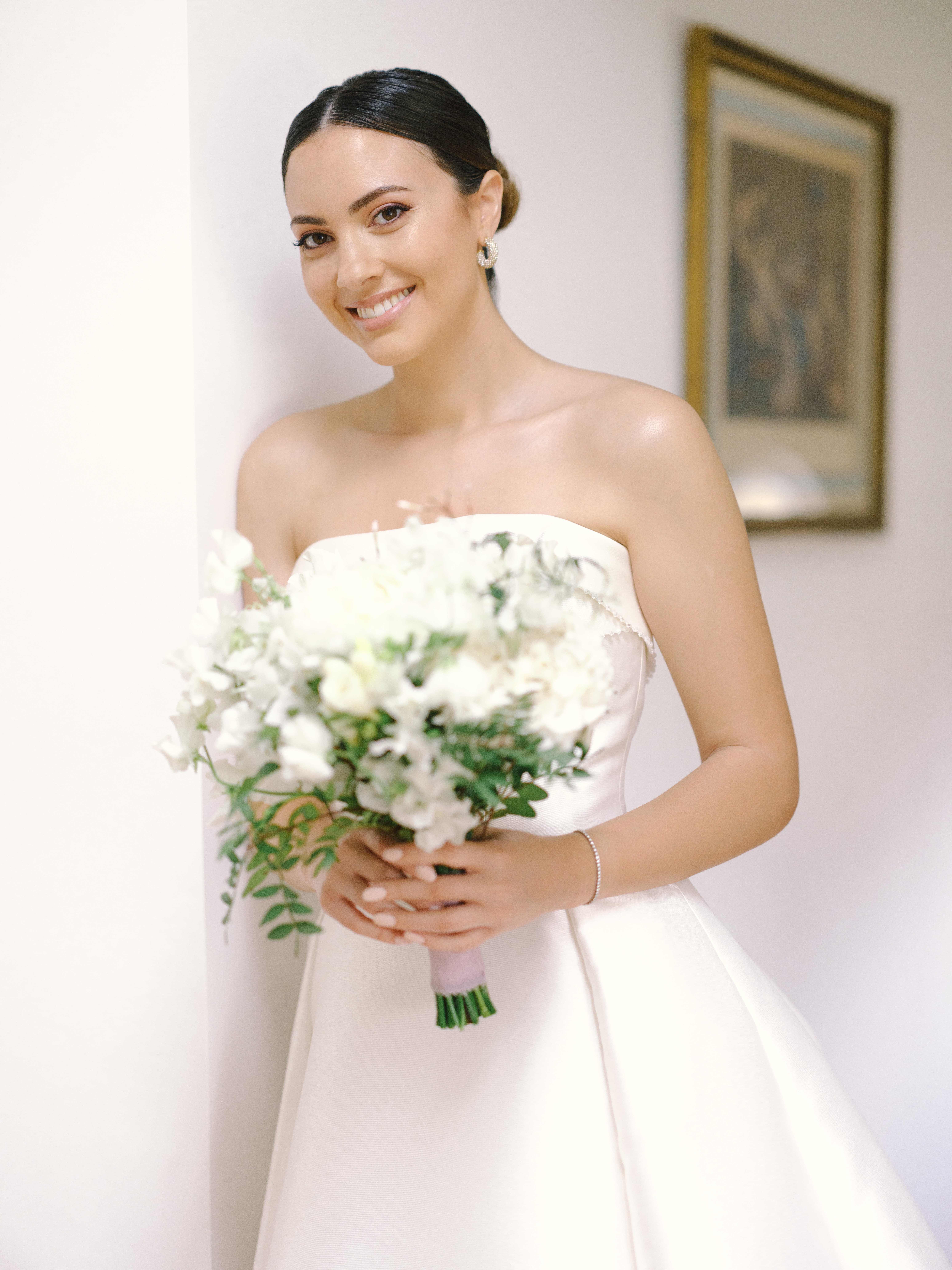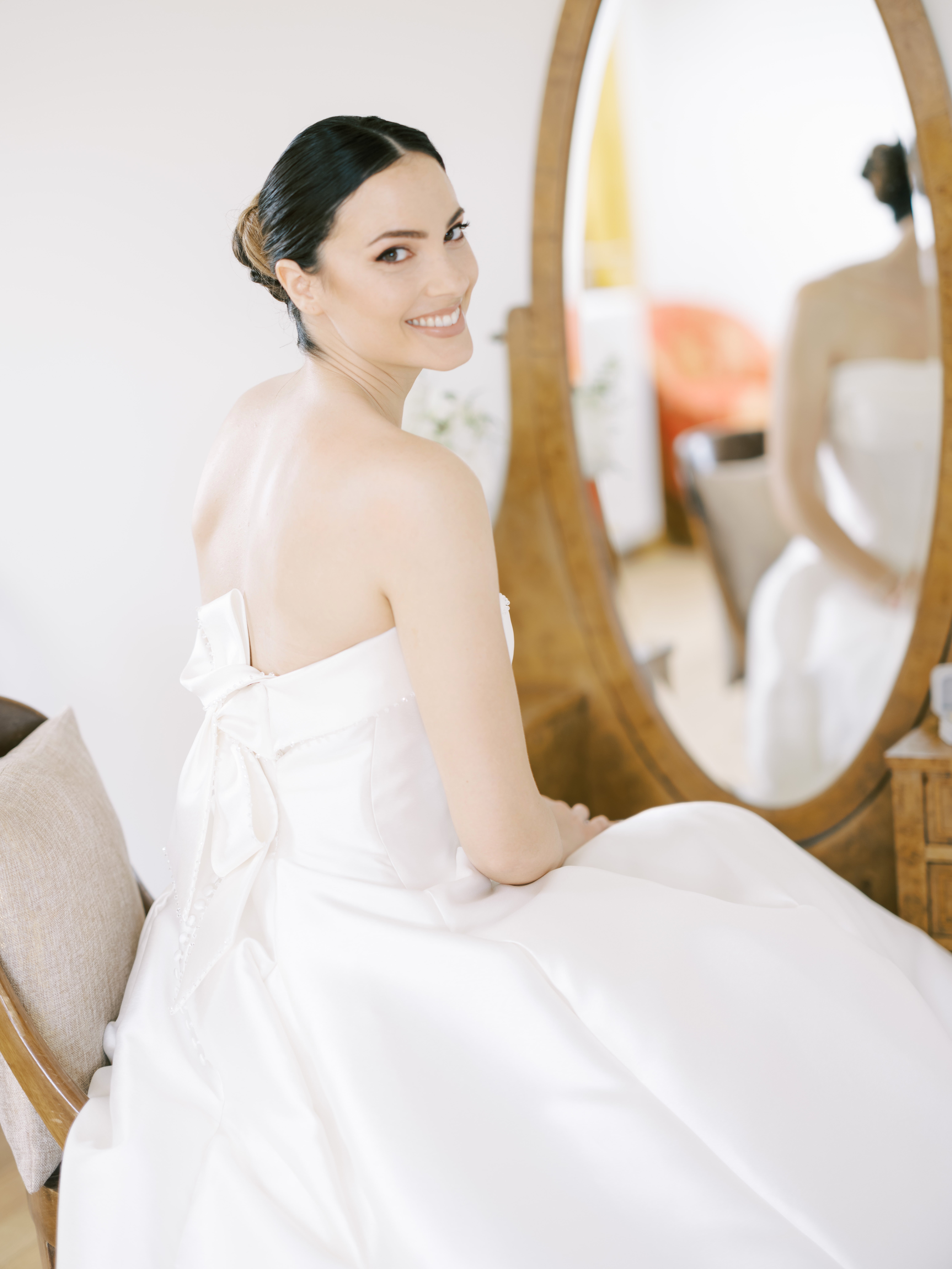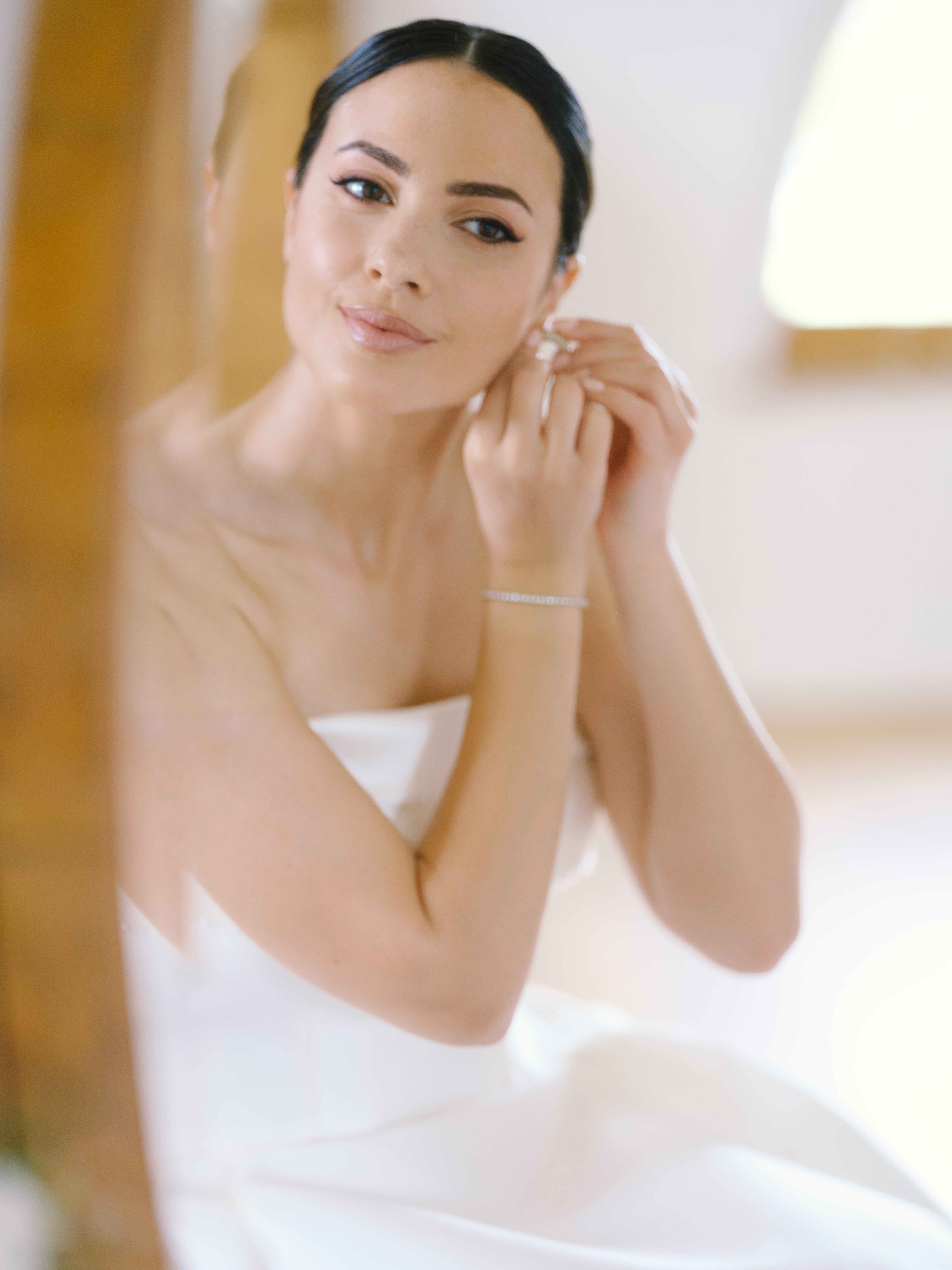The bride posed in her Alberto Palatchi princess-cut gown with gemstone details, the chateau's stone walls and crystal chandeliers forming a regal backdrop. Still Miracle captured the interplay of couture and architecture, with the Garonne River views adding depth to each frame. Later, the shift to an Atelier Pronovias halter dress marked the transition from ceremony to evening.