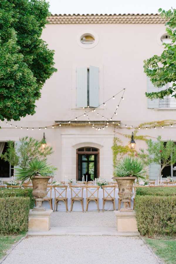 Dinner was set outdoors under string lights, with a bridal party portrait on the manicured lawn opening the evening. Blush linens and natural tableware softened the rustic Provencal setting. Speeches in English and French drew heartfelt reactions before dancing carried the celebration deep into the warm evening.