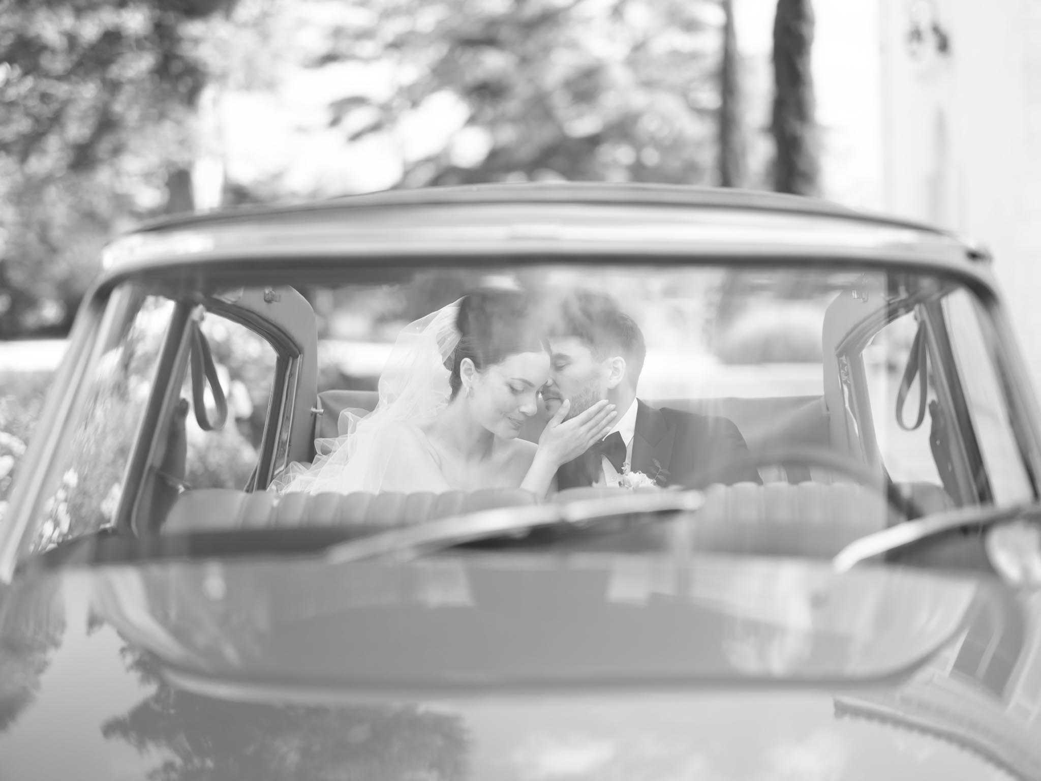 In fashion, restraint runs even deeper. French bridal style favours clean silhouettes in a single fabric: silk crepe, duchess satin, or fine lace with no embellishment beneath. The gown works with the architecture rather than competing with it. Hair stays undone or softly pulled back. Jewellery is minimal. The groom wears a well-cut navy or charcoal suit, rarely a full morning coat. Bridesmaids, where they exist at all, wear their own dresses in a loosely coordinated palette rather than matching gowns.